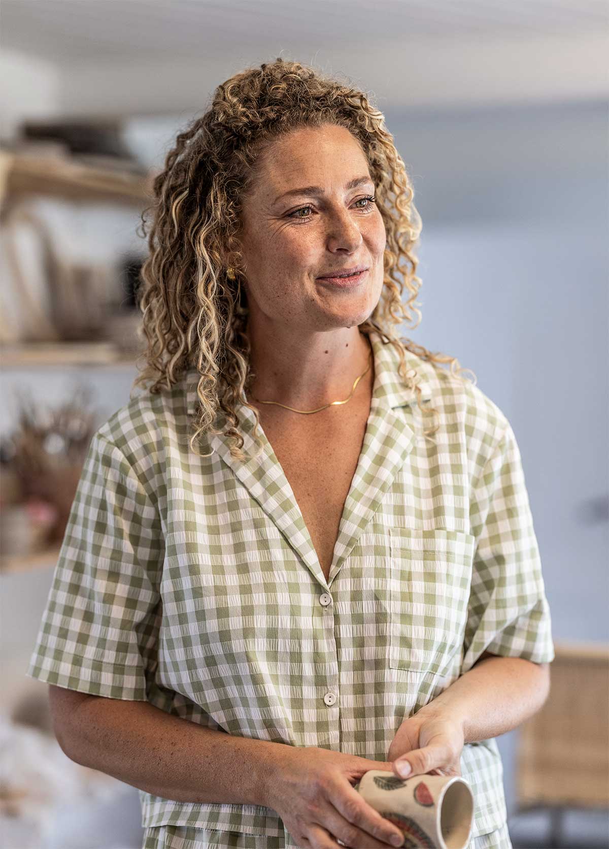 Jeg bor med min mand og vores tre børn på en bondegård i Saksild, syd for Aarhus. Her har vi dyr og planter og masser af liv. I det gamle stuehus fra 1874 har jeg indrettet et lille keramikværksted. Det er lavloftet og råt, men fyldt med ro, hygge og hjerterum. Her producerer jeg al min keramik, og så har jeg kurser og workshops.
